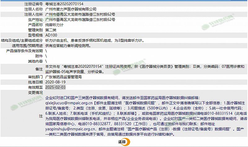 生產(chǎn)企業(yè): 廣州市麥力聲醫(yī)療器械有限公司