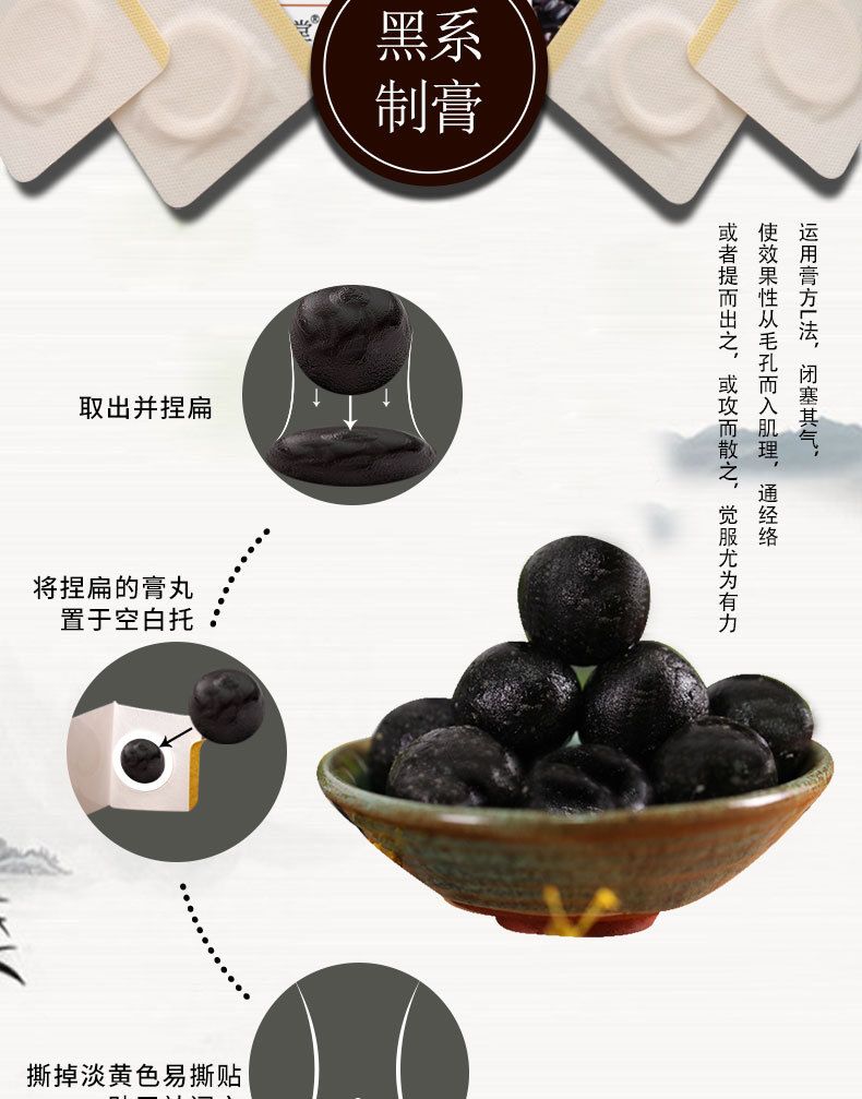 | 產(chǎn)品賣點 | 1、借鑒中醫(yī)透皮技術(shù),添純中藥透皮成分,見效快。 2、黑膏藥劑型,中草藥提煉而成,藥效持久,溫和,孩子愛貼,大人放心。 3、采用中醫(yī)穴位貼敷療法,多穴位精準貼敷,效果**。 4、6類疾病,使用范圍廣泛,且不受季節(jié)限制。 5、人性化設計,內(nèi)置穴位指導圖,操作使用便捷。 |