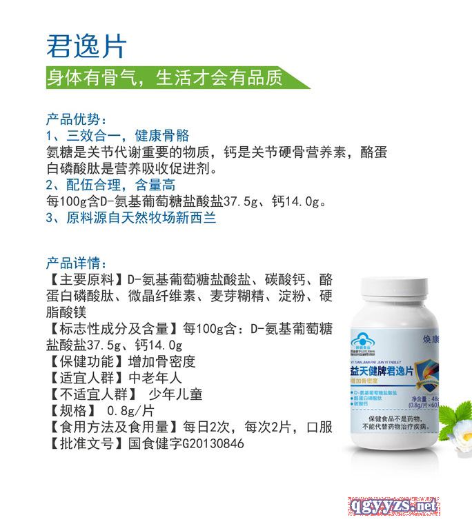 | 補充說明 | 1、氨糖是形成軟骨細(xì)胞的重要營養(yǎng)素之一,也是軟骨基質(zhì)和關(guān)節(jié)液的基本成分。有助于修復(fù)關(guān)節(jié)軟骨,催生和補充關(guān)節(jié)滑液,清楚關(guān)節(jié)腔垃圾,提高骨骼免疫力。2、鈣是**人體骨骼和牙齒健康的一種必要的礦物質(zhì),骨鈣的數(shù)量減少了,骨的堅實程度自然會下降。所以維持骨健康,要適量補鈣。3、酪蛋白磷酸肽能使游離鈣保持較高的濃度,促進鈣的被動吸收。 產(chǎn)品優(yōu)勢 1. 高含量:標(biāo)志性成分:1,每100g含:D-氨基葡萄糖鹽酸鹽37.5g;鈣14.0g; 2. 氨基葡萄糖鹽酸鹽:能促進人體粘多糖的合成,提高關(guān)節(jié)滑液的粘性,能改善關(guān)節(jié)軟骨的代謝 3. 鈣含量高,補充鈣元素 4. 酪蛋白磷酸肽促進鈣吸收 5. 增加骨密度,—修復(fù)軟骨,強健骨骼! 6. 原料源自天然牧場新西蘭 7. 全國**產(chǎn)品 8. 國家食品藥品監(jiān)督管理局批注的保健食品,功能成分以及含量都有嚴(yán)格的執(zhí)行標(biāo)準(zhǔn) 9. 新產(chǎn)品上市全國招商 10. 銷量好,產(chǎn)品**高 規(guī)格:0.8g一片 【主要原料】D-氨基葡萄糖鹽酸鹽、碳酸鈣、酪蛋白磷酸肽、微晶纖維素、麥芽糊精、淀粉、硬脂酸鎂 【標(biāo)志性成分及含量】每100g含:D-氨基葡萄糖鹽酸鹽37.5、鈣14.0g 【保健功能】具有增加骨密度的保健功能 【適宜人群】中老年人 【食用方法及食用量】每日2次,每次2片,口服 【產(chǎn)品規(guī)格】0.8g/片 【保質(zhì)期】24個月 【貯藏方法】密封,常溫干燥處保存 【批準(zhǔn)文號】國食健字G20130846 【生產(chǎn)商】山東健康源生物工程有限公司 |