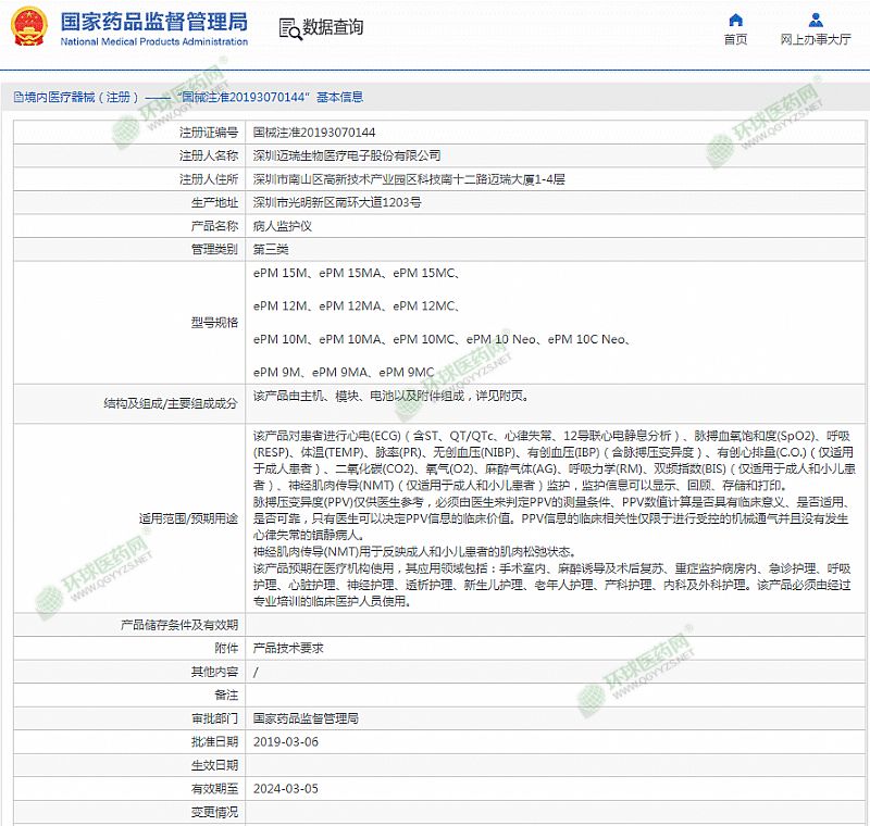 生產(chǎn)企業(yè): 深圳邁瑞生物醫(yī)療電子股份有限公司