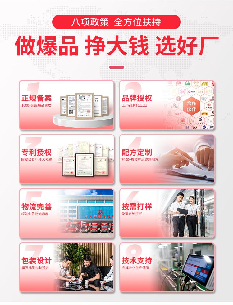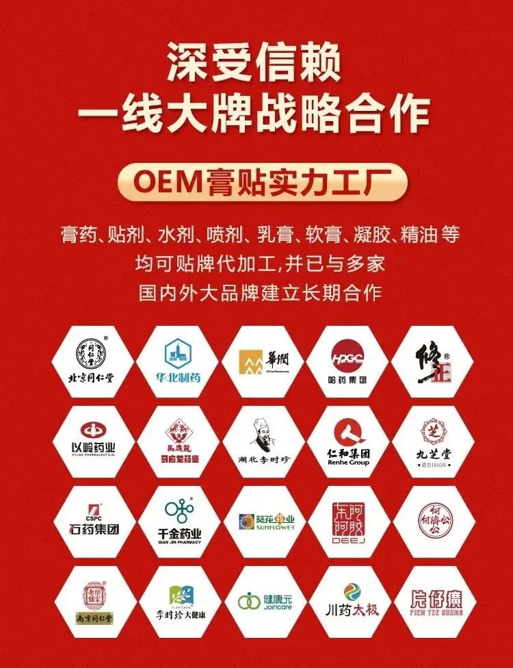 | 補充說明 | 注意事項:1市場大:膏藥的空白市場很大, 消費群體廣大。每個人都可能用到膏藥,并且有嚴(yán)格的區(qū)域保護。 2經(jīng)營活:可以自己在電商、微信上賣,可以做直播、短視頻,也可以和各大醫(yī)院、藥店、美容店合作。 3品種多:膏藥有:骨科、兒科、婦科、癥狀類等。化妝品有面膜、精華液、水乳霜、彩妝、套盒、洗沐護等。 4操作易:專業(yè)的客服團隊每月定期回訪,根據(jù)不同市場提供指導(dǎo)、培訓(xùn)、廣告、促銷活動支持! 貯藏:干燥陰涼 禁忌:無 保質(zhì)期:兩年 備注:1、優(yōu)質(zhì)服務(wù):專業(yè)OEM服務(wù)團隊一對一服務(wù),從設(shè)計到出貨全程專人跟進。 2、出貨迅速:包裝定稿,專業(yè)生產(chǎn)團隊可在10—15天內(nèi)交付發(fā)貨。 3、質(zhì)量**:從生產(chǎn)至出廠五道質(zhì)檢嚴(yán)格把關(guān),全自動四邊封口機器密封性更好,產(chǎn)品更美觀 4、權(quán)威認(rèn)證:國家FDA認(rèn)證的一類醫(yī)療器械文號,藥監(jiān)局可查,十萬級凈化標(biāo)準(zhǔn)生產(chǎn)車間,品質(zhì)有**。 5、經(jīng)驗豐富:20年生產(chǎn)加工經(jīng)驗,已為上百個品牌提供服務(wù),產(chǎn)品已出口多個國家和地區(qū)。 6、產(chǎn)量充足:現(xiàn)代化生產(chǎn)車間、進口全自動生產(chǎn)線,日產(chǎn)量100萬片。 7、品類齊全:300多款成熟配方(妝字號、械字號、消字號)免費打樣 |