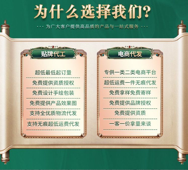 | 補(bǔ)充說明 | 注意事項:1市場大:膏藥的空白市場很大, 消費(fèi)群體廣大。每個人都可能用到膏藥,并且有嚴(yán)格的區(qū)域保護(hù)。 2經(jīng)營活:可以自己在電商、微信上賣,可以做直播、短視頻,也可以和各大醫(yī)院、藥店、美容店合作。 3品種多:膏藥有:骨科、兒科、婦科、癥狀類等;瘖y品有面膜、精華液、水乳霜、彩妝、套盒、洗沐護(hù)等。 4操作易:專業(yè)的客服團(tuán)隊每月定期回訪,根據(jù)不同市場提供指導(dǎo)、培訓(xùn)、廣告、促銷活動支持! 貯藏:干燥陰涼 禁忌:無 保質(zhì)期:兩年 備注:1、優(yōu)質(zhì)服務(wù):專業(yè)OEM服務(wù)團(tuán)隊一對一服務(wù),從設(shè)計到出貨全程專人跟進(jìn)。 2、出貨迅速:包裝定稿,專業(yè)生產(chǎn)團(tuán)隊可在10—15天內(nèi)交付發(fā)貨。 3、質(zhì)量**:從生產(chǎn)至出廠五道質(zhì)檢嚴(yán)格把關(guān),全自動四邊封口機(jī)器密封性更好,產(chǎn)品更美觀 4、權(quán)威認(rèn)證:國家FDA認(rèn)證的一類醫(yī)療器械文號,藥監(jiān)局可查,十萬級凈化標(biāo)準(zhǔn)生產(chǎn)車間,品質(zhì)有**。 5、經(jīng)驗豐富:20年生產(chǎn)加工經(jīng)驗,已為上百個品牌提供服務(wù),產(chǎn)品已出口多個國家和地區(qū)。 6、產(chǎn)量充足:現(xiàn)代化生產(chǎn)車間、進(jìn)口全自動生產(chǎn)線,日產(chǎn)量100萬片。 7、品類齊全:300多款成熟配方(妝字號、械字號、消字號)免費(fèi)打樣 |