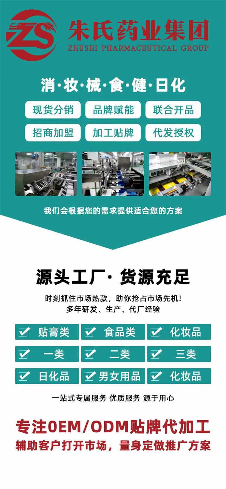 | 補(bǔ)充說明 | 注意事項(xiàng):1市場(chǎng)大:膏藥的空白市場(chǎng)很大, 消費(fèi)群體廣大。每個(gè)人都可能用到膏藥,并且有嚴(yán)格的區(qū)域保護(hù)。 2經(jīng)營(yíng)活:可以自己在電商、微信上賣,可以做直播、短視頻,也可以和各大醫(yī)院、藥店、美容店合作。 3品種多:膏藥有:骨科、兒科、婦科、癥狀類等;瘖y品有面膜、精華液、水乳霜、彩妝、套盒、洗沐護(hù)等。 4操作易:專業(yè)的客服團(tuán)隊(duì)每月定期回訪,根據(jù)不同市場(chǎng)提供指導(dǎo)、培訓(xùn)、廣告、促銷活動(dòng)支持! 5回報(bào)高:膏藥代理,不需要租門店不需要過多的人工。并且膏藥**高。 貯藏:干燥陰涼 禁忌:無(wú) 保質(zhì)期:兩年 備注:1、優(yōu)質(zhì)服務(wù):專業(yè)OEM服務(wù)團(tuán)隊(duì)一對(duì)一服務(wù),從設(shè)計(jì)到出貨全程專人跟進(jìn)。 2、出貨迅速:包裝定稿,專業(yè)生產(chǎn)團(tuán)隊(duì)可在10—15天內(nèi)交付發(fā)貨。 3、質(zhì)量**:從生產(chǎn)至出廠五道質(zhì)檢嚴(yán)格把關(guān),全自動(dòng)四邊封口機(jī)器密封性更好,產(chǎn)品更美觀 4、權(quán)威認(rèn)證:國(guó)家FDA認(rèn)證的一類醫(yī)療器械文號(hào),藥監(jiān)局可查,十萬(wàn)級(jí)凈化標(biāo)準(zhǔn)生產(chǎn)車間,品質(zhì)有**。 5、經(jīng)驗(yàn)豐富:20年生產(chǎn)加工經(jīng)驗(yàn),已為上百個(gè)品牌提供服務(wù),產(chǎn)品已出口多個(gè)國(guó)家和地區(qū)。 6、產(chǎn)量充足:現(xiàn)代化生產(chǎn)車間、進(jìn)口全自動(dòng)生產(chǎn)線,日產(chǎn)量100萬(wàn)片。 7、品類齊全:300多款成熟配方(妝字號(hào)、械字號(hào)、消字號(hào))免費(fèi)打樣 |