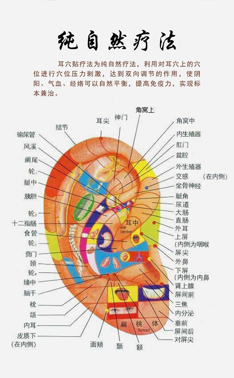 | 作用機(jī)理 | 耳穴貼壓療法,是耳穴療法中常見(jiàn)的一種,也是中醫(yī)特色療法之一,耳穴貼壓療法是使用藥物、磁珠等圓形物質(zhì)(常用的為王不留行籽)貼敷在耳穴上而達(dá)到輔助治病目的的一種療法。 |