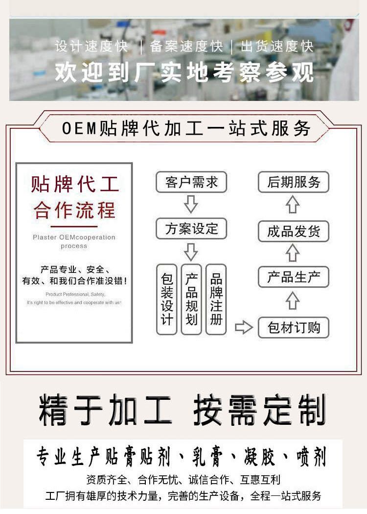 | 補充說明 | 貼代牌加工,形狀規(guī)格大小可定制 產(chǎn)品系列:各類貼劑、膏劑、膏藥、消毒消用殺品、化妝品、保健食品、日化用品、保健產(chǎn)品、臨床產(chǎn)品、耗材列系等 |