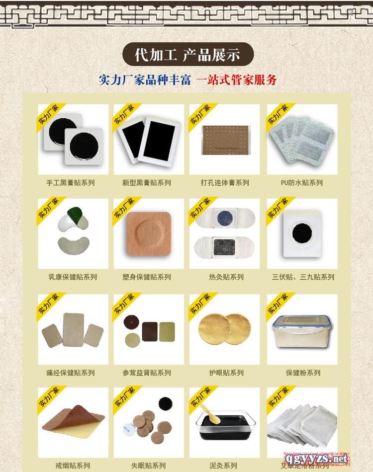 | 補(bǔ)充說明 | 貼代牌加工,形狀規(guī)格大小可定制 產(chǎn)品系列:各類貼劑、膏劑、膏藥、消毒消用殺品、化妝品、保健食品、日化用品、保健產(chǎn)品、臨床產(chǎn)品、耗材列系等 |