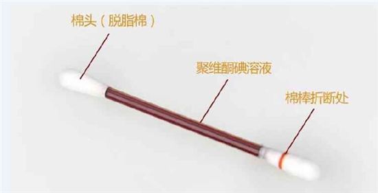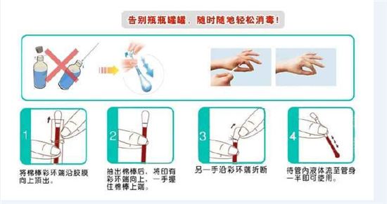 | 使用方法 | 取出棉棒后,將印有彩環(huán)端朝上,一手握住棉棒上端,另一手沿彩環(huán)處折斷,待管內(nèi)液體自動(dòng)流入并浸濕另一端棉頭,用濕棉頭涂擦即可。 |