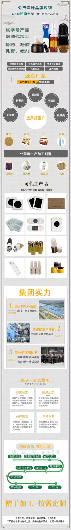 | 補(bǔ)充說明 | 貼代牌加工,形狀規(guī)格大小可定制 產(chǎn)品系列:各類貼劑、膏劑、膏藥、消毒消用殺品、化妝品、保健食品、日化用品、保健產(chǎn)品、臨床產(chǎn)品、耗材列系等 |