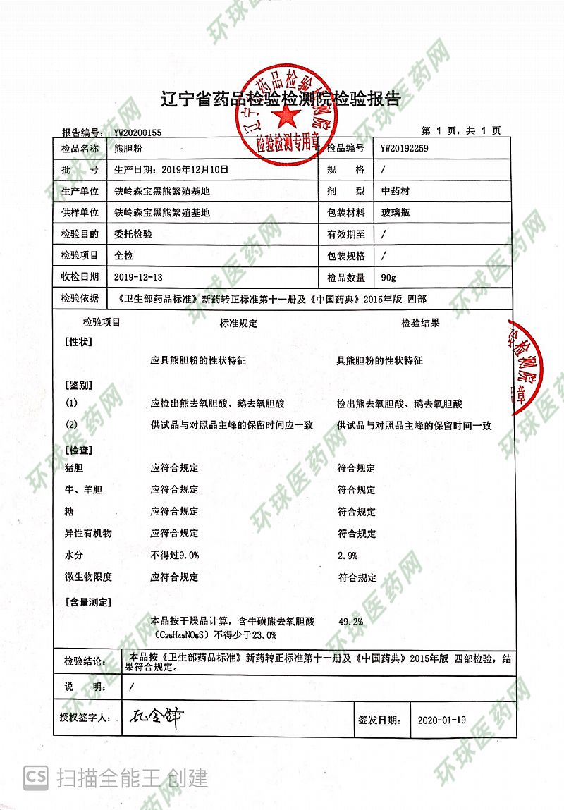 | 其它說(shuō)明 | 遼寧鐵嶺神熊藥業(yè)有限公司,始建于1989年,已經(jīng)近30年的馴養(yǎng)繁殖熊類(lèi)野生動(dòng)物的歷史,是國(guó)家藥品食品監(jiān)督管理局和國(guó)家林業(yè)局指定飼養(yǎng)、繁殖、馴化熊產(chǎn)品加工為一體的黑熊養(yǎng)殖企業(yè)。 本公司為了保護(hù)野生動(dòng)物資源,弘揚(yáng)中華民族中藥,開(kāi)發(fā)動(dòng)物性藥物為人類(lèi)健康服務(wù)為宗旨,采取先進(jìn)的自體造管無(wú)痛引流采膽高新技術(shù),引流***熊膽汁,生產(chǎn)出的《帽峰山》牌熊膽粉,是黑熊膽汁的純干燥品,產(chǎn)品質(zhì)量經(jīng)藥檢部門(mén)檢驗(yàn),;切苋パ跄懰幔–26H45NO8S)含量達(dá)到40%以上,符合和超過(guò)國(guó)家頒布標(biāo)準(zhǔn)(≥23%) |