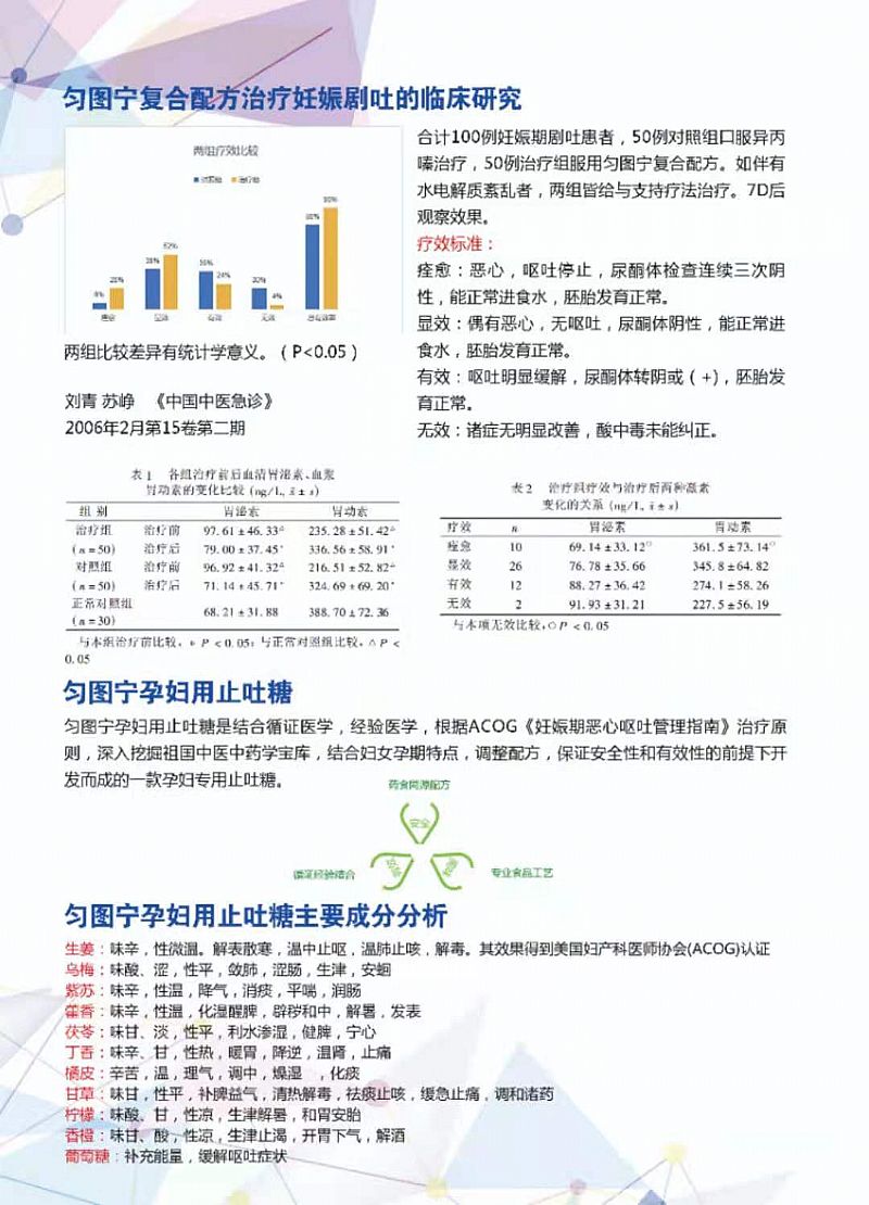 | 作用機理 | 勻圖寧的十味藥食同源配方遵循了經(jīng)典的“君一,臣三,佐五,使一”的原則,(即君臣佐使)。生姜溫中止嘔為君,藿香化濕醒脾,丁香暖胃降逆,茯苓利水滲濕為臣,烏梅斂肺澀腸,紫蘇行氣和胃,橘皮理氣調(diào)中,檸檬和胃安胎,香橙開胃下氣為佐,葡萄糖和胃潤肺,調(diào)和諸藥為使。同時,生姜,丁香,藿香,紫蘇,橘皮五味偏溫,茯苓,烏梅,香橙,檸檬,葡萄糖五味平?jīng),各自結(jié)合,組方便溫而不燥,平而不涼,故有從容之號,更適合孕婦服用。 |