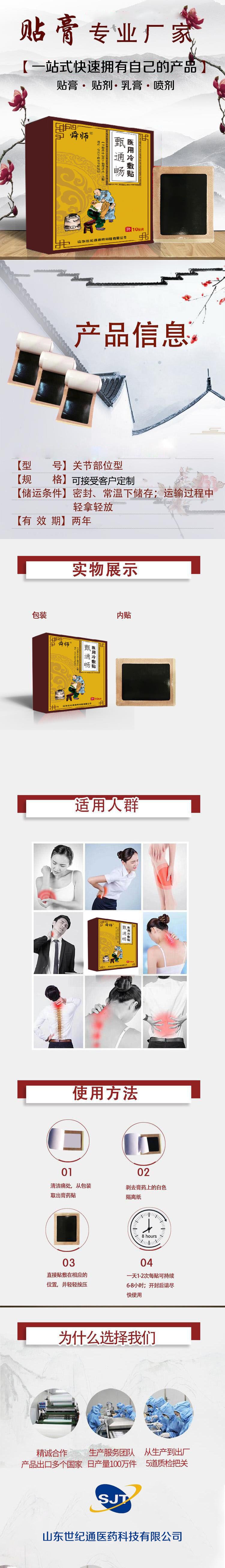 | 補(bǔ)充說(shuō)明 | 可以生產(chǎn)代加工貼牌 提供一條龍服務(wù) 如果在我們公司做貼膏oem貼牌公司可以提供文號(hào)的使用 產(chǎn)品優(yōu)勢(shì):一款包裝可匹配多種劑型,覆蓋多渠道。袋子使用易拉扣**鋁箔袋,貼數(shù)多用不完的情況下,防止變干失效,利于保存。 可定制,規(guī)格根據(jù)客戶要求 |