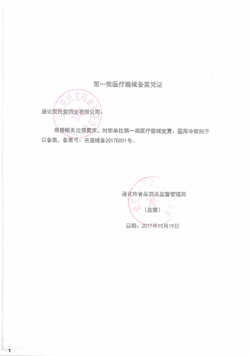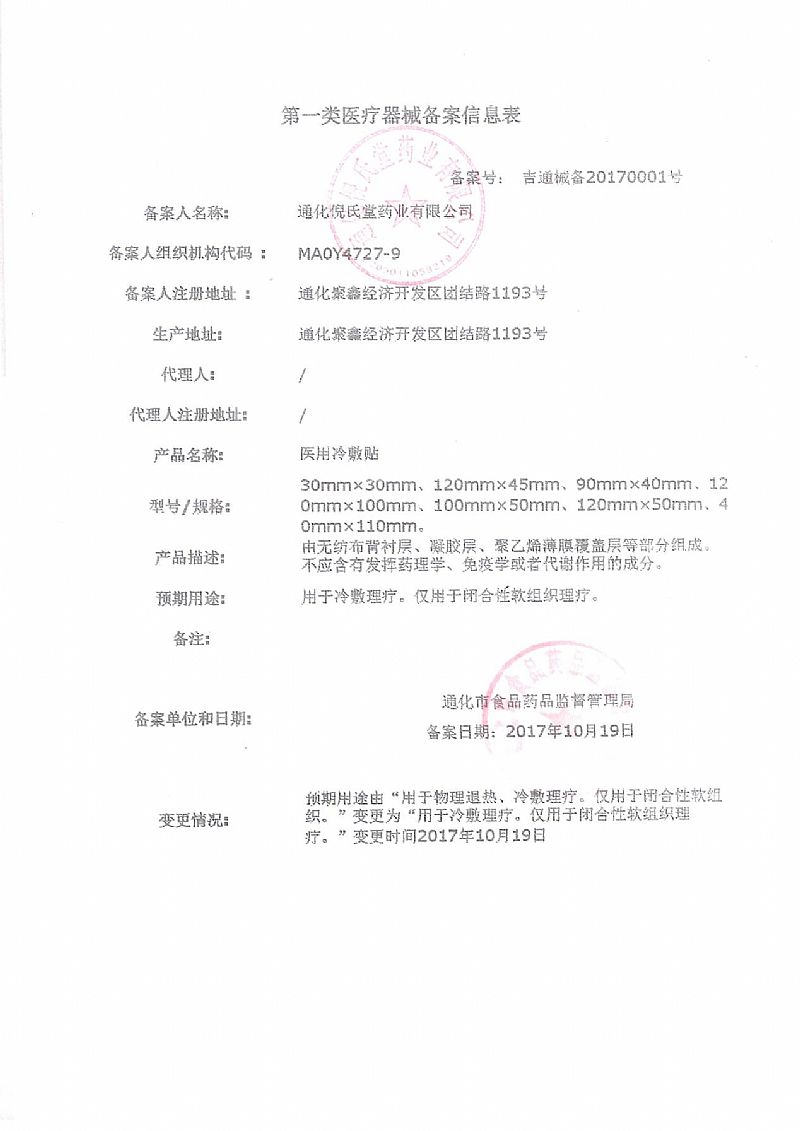 | 補充說明 | 【性能及主要結(jié)構(gòu)】本品由無紡布背襯層、凝膠層、聚乙烯薄膜覆蓋層等部分組成。不應(yīng)含有發(fā)揮藥理學(xué)、免疫學(xué)或者代謝作用的成分。 【預(yù)期用途】用于冷數(shù)理療。僅用于閉合性軟組織理療。 【注意事項】1.本品為局部外用。適用于骨病關(guān)節(jié)炎、網(wǎng)球肘、腱銷炎、滑膜炎、頸椎病、肩周炎、腰椎間盤突出、跌打損傷、骨質(zhì)增生、靜脈曲張、落枕、腰腿疼痛,肌肉疼痛,足跟炎痛,骨折、坐骨神經(jīng)痛引起的紅腫熱痛等需要冷敷理療的人群。 2.本品適用于完整皮膚,不可用于皮膚破損處。 3.本品不適用于過敏體質(zhì)的,孕婦、哺乳期婦女、嬰幼兒。 4.貼后出現(xiàn)皮膚腫脹和發(fā)炎等異常現(xiàn)象,請立即停止使用。 【使用方法】打開包裝,取出冷數(shù)貼,揭去聚乙烯薄膜、防粘紙,將背襯層貼于患處,48小時更換一次,貼敷部位癥狀明顯可適當(dāng)縮短貼敷時間,急性扭損傷應(yīng)立即使用。 【保存方法】陰涼保存 【有 效 期】36個月 【產(chǎn)品備案號】吉通械備20170001號 【產(chǎn)品技術(shù)要求編號】吉通械備20170001號 【生產(chǎn)備案編號】吉通食藥監(jiān)械生產(chǎn)備20160002號 |