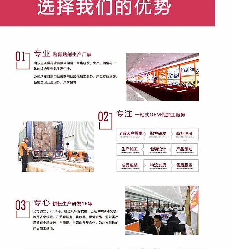 | 補充說明 | 中藥眼貼oem貼牌加工廠山東皇圣堂藥業(yè)有限公司(瓊森),大型醫(yī)療器械、保健食品、化妝品生產廠家。 中藥眼貼是指為了治療眼部某種疾病或解決眼部皮膚問題所創(chuàng)造的類似于創(chuàng)可貼的薄膜,無紡布浸泡純中藥成分,可以帖敷眼眶部位,讓藥物通過眼部吸收,來讓眼疾得到改善和緩解。 中藥眼貼貼牌加工,市場不等人,機會也只是留給有準備并且迅速出手的人。如果您看準市場,那就快速出手,可能您還在考察廠家的時候,或者您還在糾結于價格的時候,您的競爭對手的產品已經投入生產了! 【生產許可證號】魯食藥監(jiān)械生產許20140114號 【產品技術要求編號】魯械注準20152260319 【注冊證編號】魯械注準20152260319 【生產單位】山東皇圣堂藥業(yè)有限公司 【注冊地址】山東單縣經濟技術開發(fā)區(qū) |
