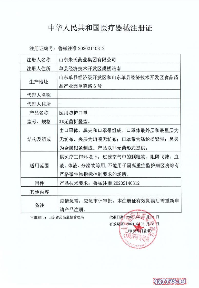 | 補(bǔ)充說(shuō)明 | 山東朱氏藥業(yè)集團(tuán),一次性使用口罩,一次性使用無(wú)菌敷貼,消毒濕巾,消毒劑,醫(yī)用一次性防護(hù)服,防護(hù)衣,隔離衣,額溫槍,醫(yī)用外科口罩,酒精,84消毒液,免洗手凝膠等生產(chǎn)廠家,多省中標(biāo),資質(zhì)齊全,歡迎咨詢:(微信同號(hào)) |