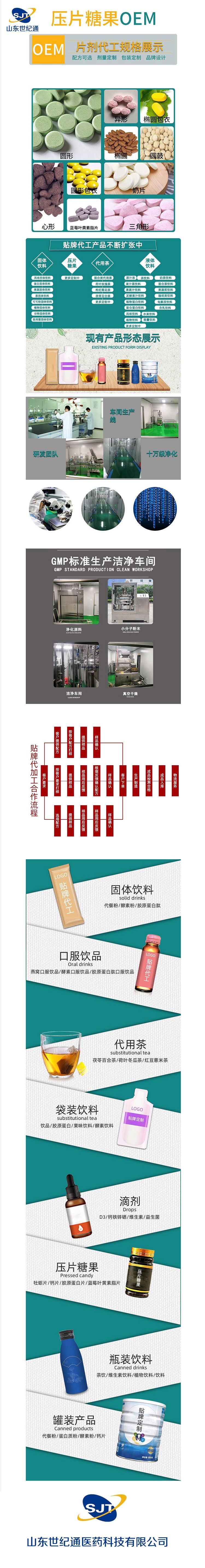 | 補充說明 | 山東世紀通醫(yī)藥科技專注功能性健康食品委托生產(chǎn)代加工十六年,具有豐富的行業(yè)資源和生產(chǎn)經(jīng)驗。委托生產(chǎn)范圍:食品類包括:固體飲料、壓片糖果、代用茶、含茶制品、茶葉分裝等。保健食品類包括:壓片糖果、固體飲料、風味飲品等。更多產(chǎn)品及配方研發(fā),歡迎來電咨詢洽談,歡迎來廠參觀!山東世紀通全體人員以滿腔的熱情支持客戶的成功,期待和您合作共贏! |
