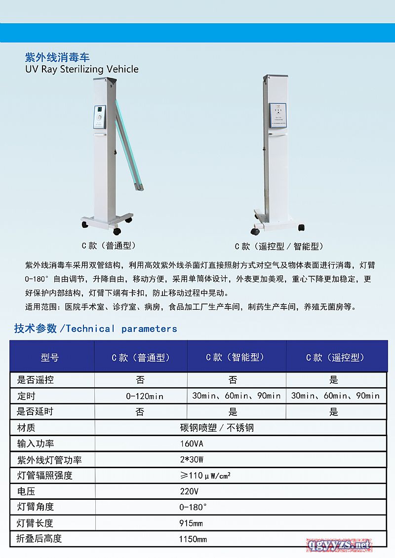 | 補(bǔ)充說明 | 注意事項(xiàng) 1、應(yīng)保持殺菌燈管表面清潔,每?jī)芍軐?duì)紫外燈管做一次清潔,用醫(yī)用酒精擦拭燈管上的灰塵和油污,否則會(huì)影響殺菌效果。 2、應(yīng)**殺菌效果,使用時(shí)注意調(diào)整紫外燈管和臺(tái)面的垂直角度(60°~90°)和高度(距被照射處55cm左右),此設(shè)備發(fā)出的紫外波長(zhǎng)為254nm。 3、平常使用需注意不可直接照射樣本,以免造成樣本失效。 4、紫外線對(duì)有機(jī)細(xì)胞有殺傷力,人的皮膚和眼鏡如較長(zhǎng)時(shí)間暴露在紫外線下會(huì)造成灼傷,因此使用時(shí)人員應(yīng)該離開房間。 5、定時(shí)器能在0~120分鐘內(nèi)任意調(diào)節(jié)消毒時(shí)間,工作完畢會(huì)自動(dòng)切斷電源,定時(shí)器必須按順時(shí)針方向使用,嚴(yán)禁反方向使用。 6、若移動(dòng)紫外線消毒車在使用中需進(jìn)入房間,可選配遙控款遠(yuǎn)程控制器關(guān)閉紫外線再進(jìn)入房間,離開房間記得打開紫外線讓設(shè)備繼續(xù)工作。 |
