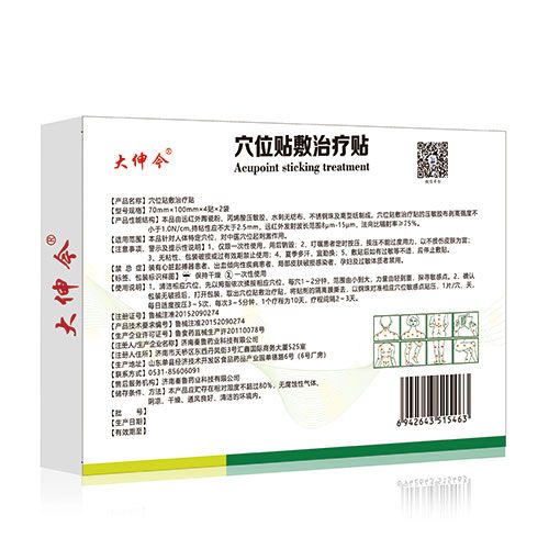 | 使用方法 | 1、清潔相應(yīng)穴位,先以拇指依次操按相應(yīng)穴位,每穴1~2分鐘,范圍由小到大,力量由輕到重,探尋敏感點(diǎn)。2、確認(rèn)包裝無破損后,打開包裝,取出穴位貼敷治療貼,將貼劑的隔離膜撕去,以鋼珠對(duì)準(zhǔn)相應(yīng)穴位敏感點(diǎn)貼壓,1片/穴、天,每日適度按壓3~5次,每次3~5分鐘,1個(gè)療程為10天,療程間隔2~3天。 |
