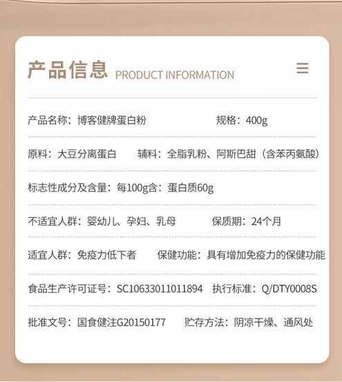 | 產(chǎn)品規(guī)格 | 400克,每100克含蛋白質(zhì)60克 |