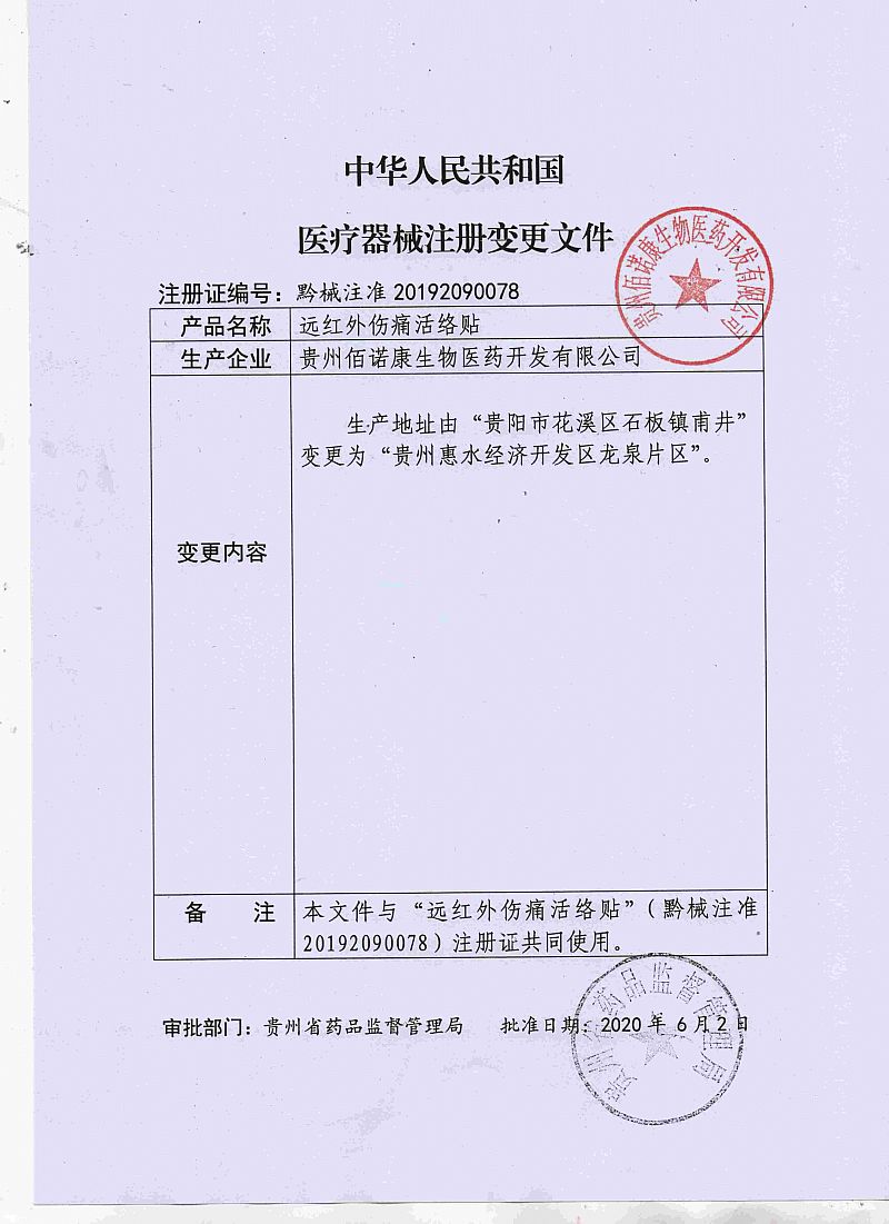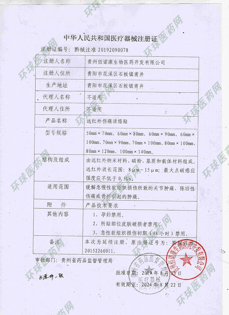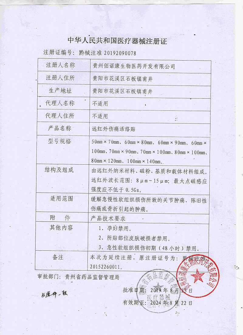 | 補(bǔ)充說(shuō)明 | 【適用范圍】緩解急慢性軟組織損傷所致的關(guān)節(jié)腫痛、陳舊性傷痛或者骨折引起的腫痛。 【使用方法】外用。清潔皮膚,將貼片揭去離型紙,貼于患處。每日一貼,每貼6-12小時(shí),7天為一療程。 【注意事項(xiàng)】皮膚過(guò)敏者;使用過(guò)程中如果出現(xiàn)皮膚紅癢,暫停使用,癥狀自然消失。 【注冊(cè)證編號(hào)】黔械注準(zhǔn)20192090078 |