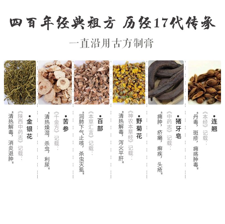 | 主要成分 | 金銀花、三色堇、苦參、百部、野菊花、茯苓、蘆根、豬牙皂、地榆、連翹、丹參、醋酸氯己定。 |