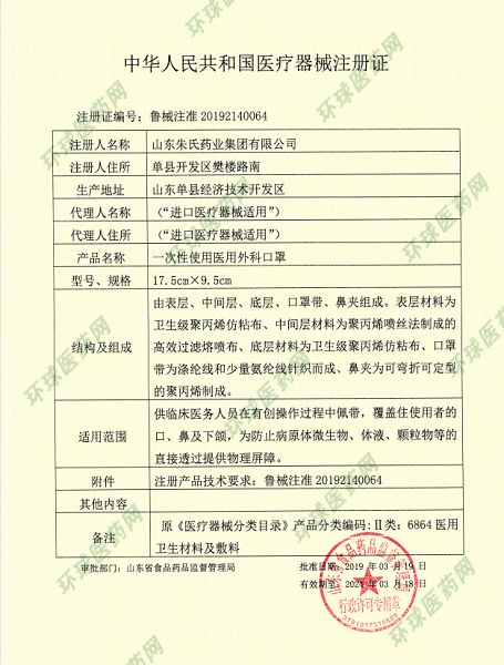| 補(bǔ)充說(shuō)明 | 【產(chǎn)品名稱】一次性使用醫(yī)用外科口罩 【型號(hào)】平面掛耳式 【規(guī)格】17.5cm*9.5cm 【執(zhí)行標(biāo)準(zhǔn)】YY 0469-2011 【滅菌方式】環(huán)氧乙烷滅菌 【注冊(cè)證編號(hào)】魯械注準(zhǔn)20192140064 【產(chǎn)品技術(shù)要求編號(hào)】魯械注準(zhǔn)20192140064 【生產(chǎn)許可證編號(hào)】魯食藥監(jiān)械生產(chǎn)許20140053號(hào) 【適用范圍】供臨床醫(yī)務(wù)人員佩戴,覆蓋住使用者的口、鼻及下頜,為防止病原體微生物、體液、顆粒物等的直接透過(guò)提供物理屏障。 【儲(chǔ)存條件】在相對(duì)濕度不大于80,清潔、避光無(wú)腐蝕性氣體、通風(fēng)良好的溫室下儲(chǔ)存。 |