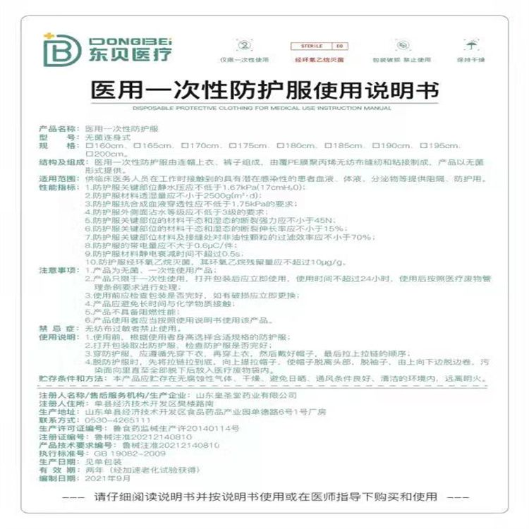 | 使用方法 | 1.本產(chǎn)品為無菌、一次性使用產(chǎn)品,有效期三年; 2.本產(chǎn)品只限于一次性使用,打開包裝后應(yīng)立即使用,使用時間不超過24小時,用 后應(yīng)焚燒處理; 3.穿著前如發(fā)現(xiàn)破損或拉鏈,鋒線等任何部位有不妥之處。則不可使用: 4防護(hù)服應(yīng)避免長時間與化學(xué)物質(zhì)接觸, 5,本產(chǎn)品無阻燃性。 |