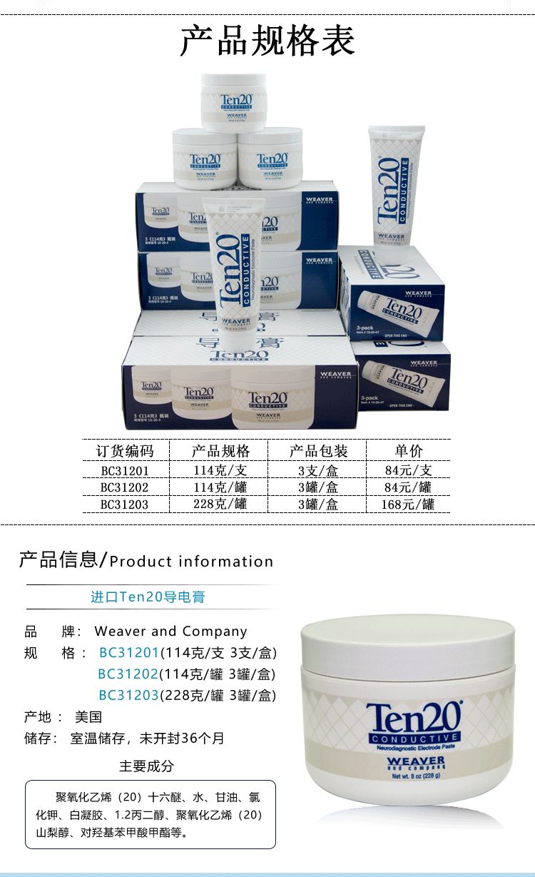 | 作用機理 | Ten20導電膏純美國進口,具有良好的粘性和導電性。 粘性:防止檢測過程中電極脫落。 導電性:使傳輸電信號清晰、可辨。 易清洗:非油性配方使它易清洗,使用溫水即可清洗干凈。 使用方便:每盒3支(罐)裝。每個包裝有產品的有效期(3年)和原料的配方。 儲存:未開封36個月,室溫密閉保存即可,避免冷藏。 |