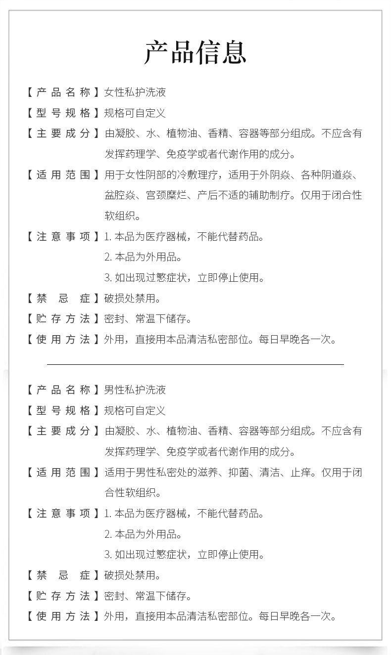 | 產(chǎn)品賣點 | 女性私護(hù)洗液,男性私護(hù)洗液 |