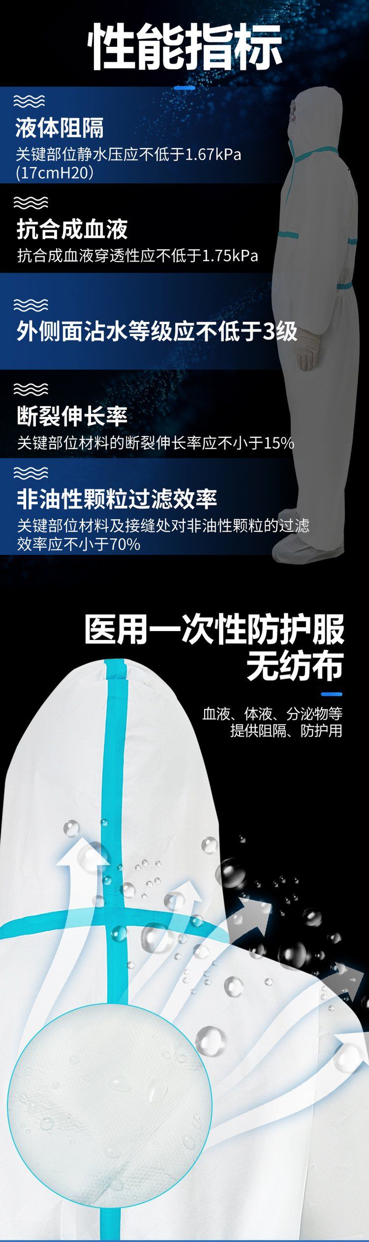 | 產(chǎn)品賣點(diǎn) | 醫(yī)用一次性防護(hù)服(以下簡稱:防護(hù)服)由連帽上衣、褲子組成,由覆PE膜聚丙烯無紡布縫紉和粘接制成,產(chǎn)品以無菌形式提供 |