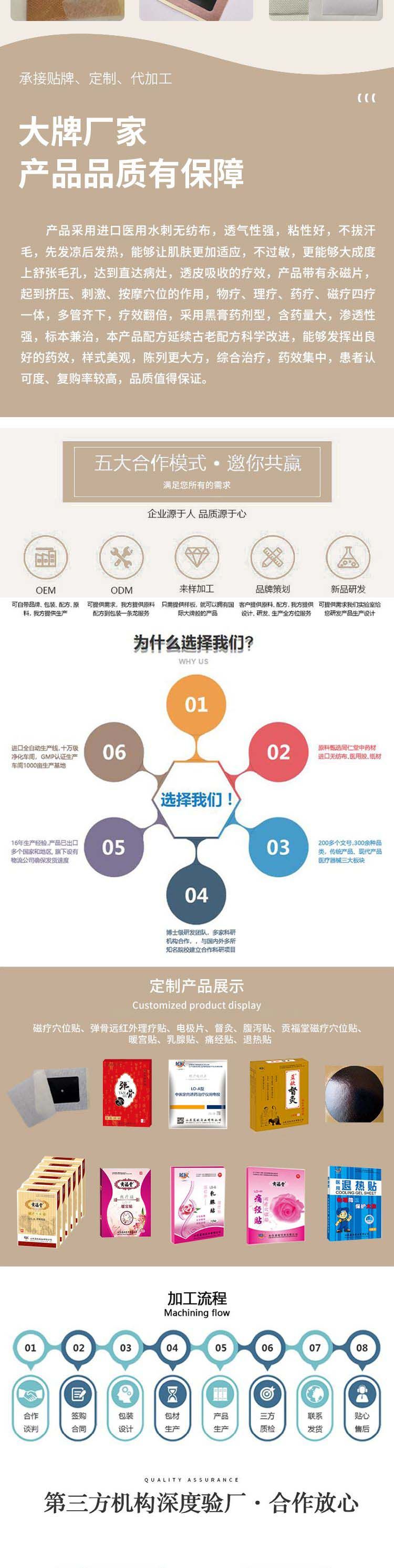| 補充說明 | 膏藥生產(chǎn)源頭廠家OEM代加工招商加盟實力廠家代加工 創(chuàng)業(yè)熱線:13805440051 OEM貼牌!代理!**豐厚!。 貼膏廠家---山東藍歐實業(yè)有限公司,承接各類貼膏貼劑OEM貼牌和代加工業(yè)務 1. 自主產(chǎn)品及代加工產(chǎn)品有:遠紅外磁療貼、理療貼、冷敷貼等、熱療貼(貼牌加工、代理,**豐厚)等 3.婦科產(chǎn)品有:暖宮貼、痛經(jīng)貼、乳腺貼等(貼牌加工、代理,**豐厚) 4.兒科產(chǎn)品有:腹瀉貼、感冒貼、止咳貼等(貼牌加工、代理,**豐厚) 藥監(jiān)局可查,幫你打造一款屬于您自己的合法產(chǎn)品。 創(chuàng)業(yè)熱線:13805440051 產(chǎn)品、**空間大,歡迎來電洽談。 |