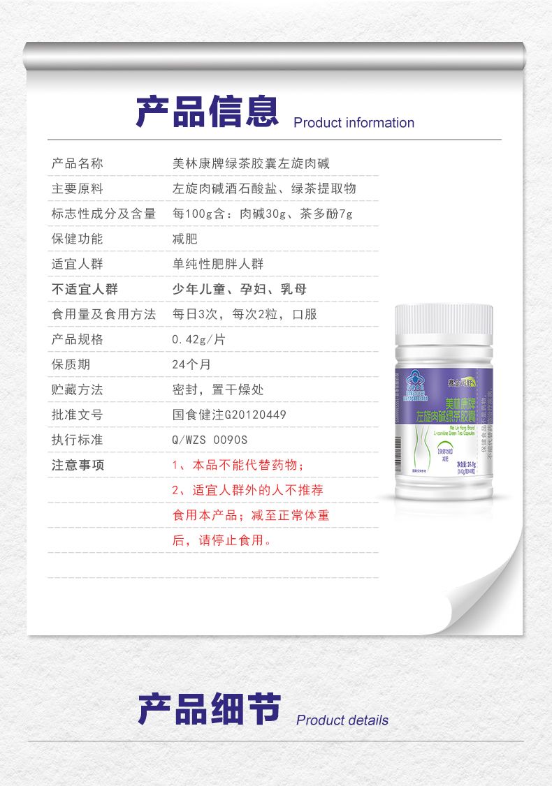 | 英文名稱 | Mei Lin Kang Brand L-carnitine Green Tea Capsules |