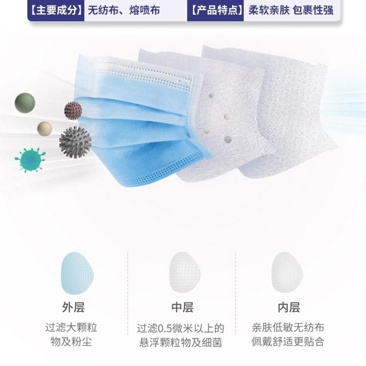 | 主要成分 | 由表層、中間層、底層、口罩帶、鼻夾組成。 |