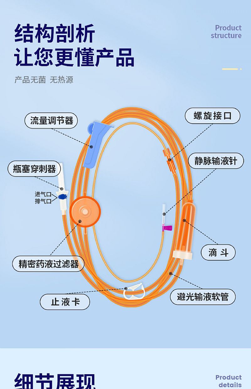 | 產(chǎn)品賣點 | 瓶塞穿刺器保護套、瓶塞穿刺器、滴管、滴斗、精密藥液過濾器、管路、流量調(diào)節(jié)器、Y注射件三通(選配件)、外圓錐接頭、靜脈輸液針、進氣件。 |