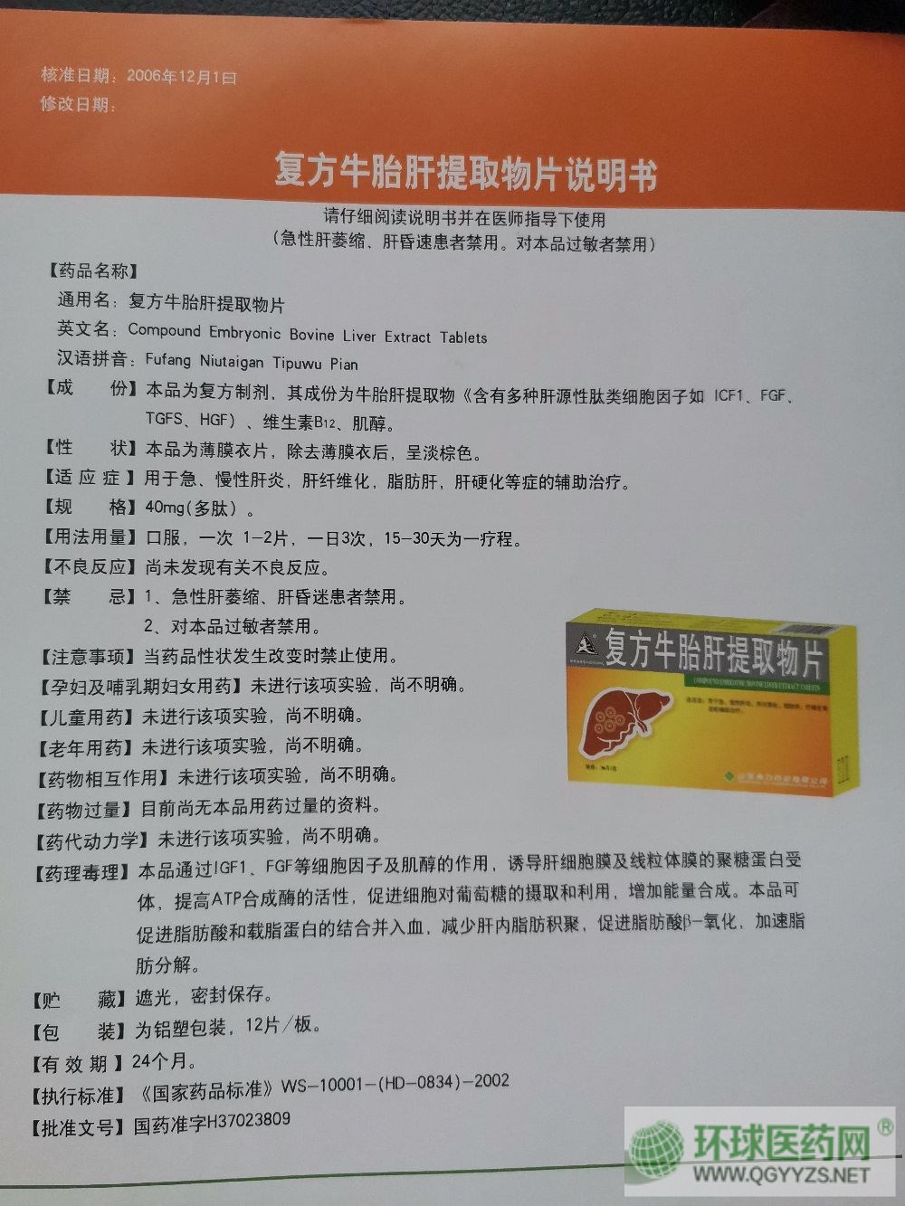| 通用名稱 | 復方牛胎肝提取物片 |