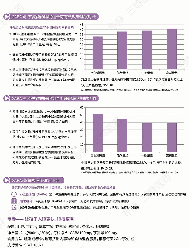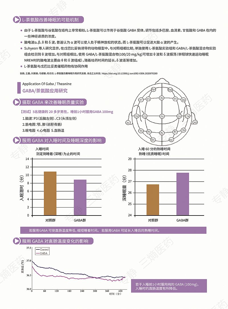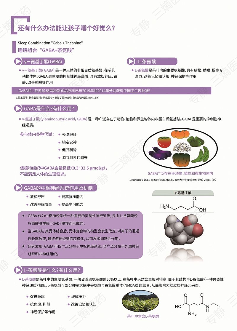 | 作用機(jī)理 | γ-氨基丁酸(GABA)是一種天然的非蛋白質(zhì)氨基酸,在哺乳動物體內(nèi),GABA是重要的抑制性神經(jīng)遞質(zhì),具有放松舒壓、鎮(zhèn)靜、改善睡眠等作用 L-茶氨酸是茶葉內(nèi)的主要氨基酸,具有放松、助眠、提高專注力、改善記憶和認(rèn)知、神經(jīng)保護(hù)等作用 GABA和L-茶氨酸這兩種新食品原料已與2019年和2014年分別獲得中國衛(wèi)生部批準(zhǔn)! γ-氨基丁酸(GABA)是一種重要的神經(jīng)遞質(zhì),參與人體多種代謝,且能夠有效促進(jìn)睡眠;L-茶氨酸同樣具有促進(jìn)睡眠的作用 |