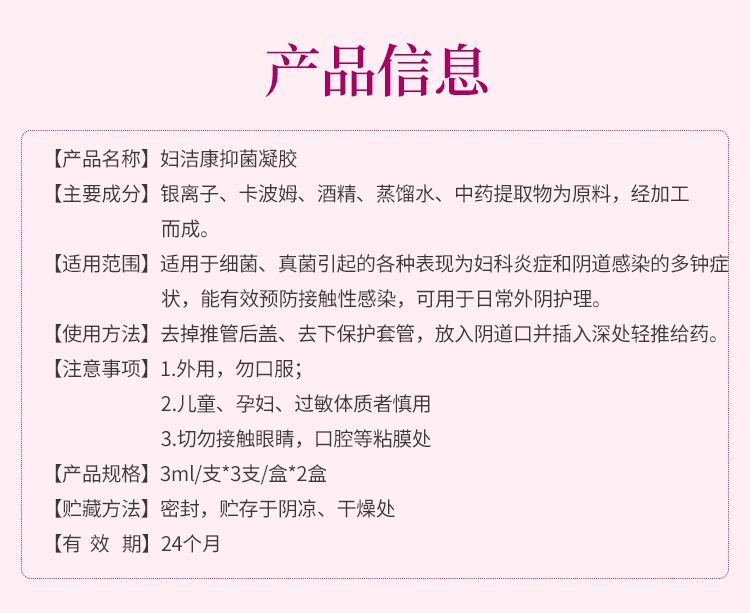 | 補(bǔ)充說明 | 1.一次性使用,包裝破損,請(qǐng)勿使用 2.陰道使用,禁止口服 3.18歲以上有性生活成年女性使用 4.孕婦禁用、經(jīng)期停用 5.忌煙酒、辛辣、油膩、海鮮等食物 6.如流出物較多,可搭配護(hù)墊使用 7.一般建議晚上使用,晚上睡覺前,將凝膠管插入陰道6-7cm深處,將凝膠保護(hù)改作為助推桿插入推進(jìn)器后端,身體平躺,把臀部略墊高,將藥慢慢推進(jìn)陰道后,拔出凝膠管,保持姿勢(shì)不動(dòng)8-10分鐘。(一天一支) 8.月經(jīng)前3天和月經(jīng)期停止使用,月經(jīng)完全干凈后3天開始使用。 |