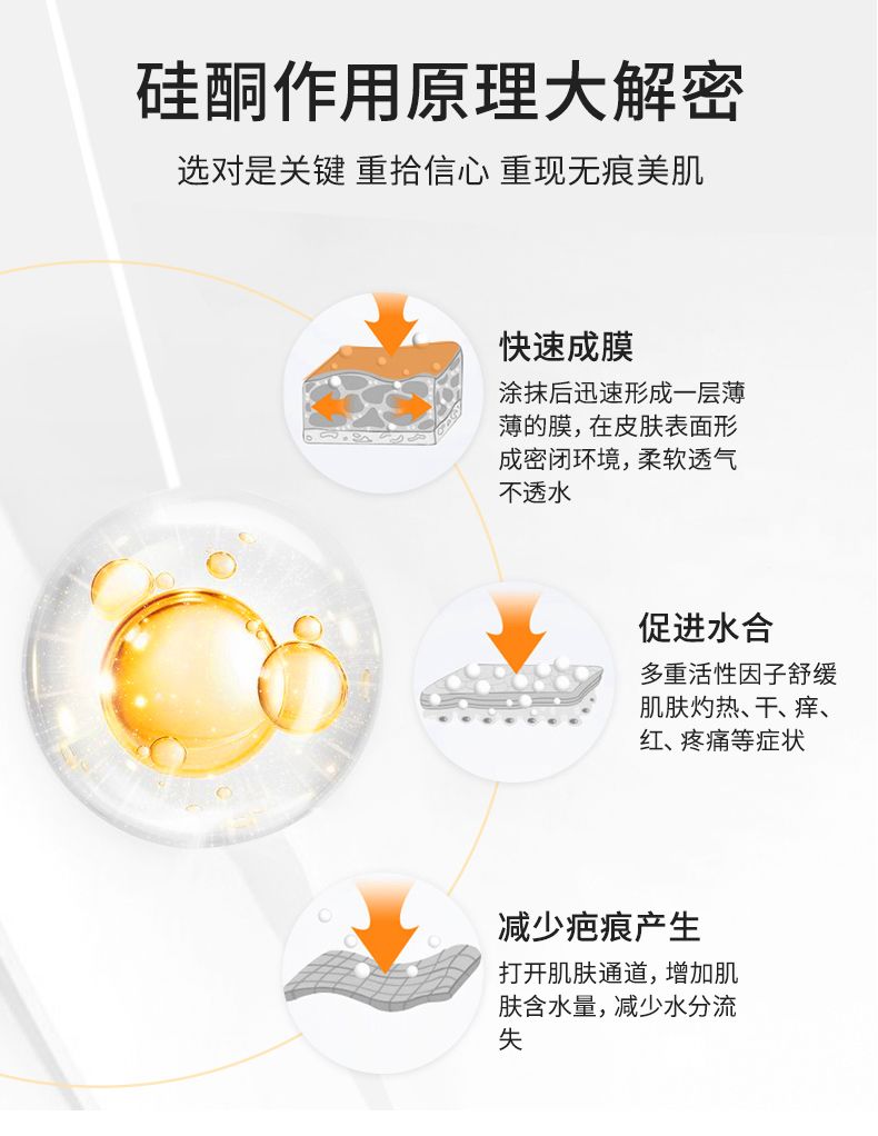 | 補(bǔ)充說(shuō)明 | 1、使用簡(jiǎn)單方便:涂抹后在患處表面會(huì)迅速形成一層薄薄的硅膠膜,即時(shí)提供患處隱形硅酮接觸治療。 2、凝膠基質(zhì):透明凝膠質(zhì)地,易于涂抹,無(wú)油膩感,滋潤(rùn)易吸收,溫和。 3、敏感肌可用:不添加激素,孕婦和兒童均可使用。 |