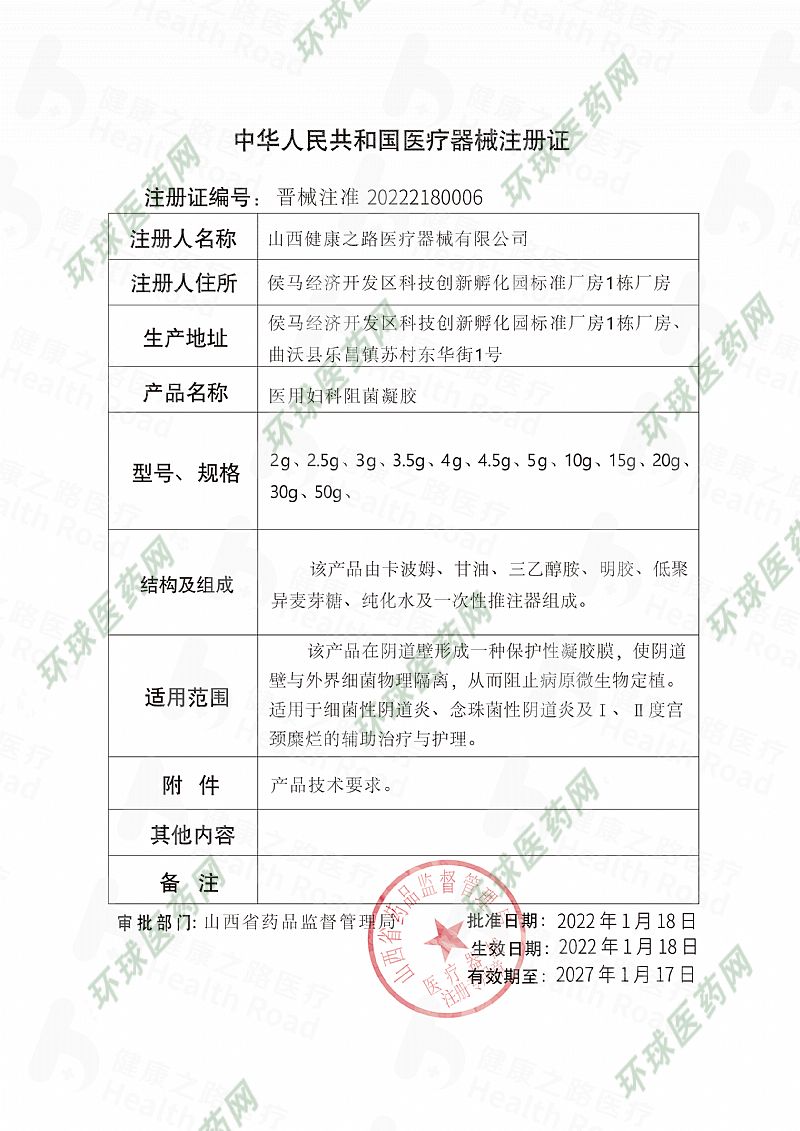 | 補(bǔ)充說明 | 【產(chǎn)品名稱】醫(yī)用婦科阻菌凝膠 【型號(hào)規(guī)格】2g、2.5 g、3g、3.5g、4g、4.5g、5g、10g、15g、20g、30g、50g 【結(jié)構(gòu)組成】該產(chǎn)品由卡波姆、甘油、三乙醇胺、明膠、低聚異麥芽糖、純化水及一次性推注器組成。 【產(chǎn)品性能】PH 3.5-6.5;微生物限度:需氧菌總數(shù)(cfu/g)≤102,霉菌和酵母菌總數(shù)(cfu/g)≤101,白色念珠菌(1g)不得檢出,金黃色葡萄球菌(1g)不得檢出,銅綠假單胞菌(1g)不得檢出。 【適應(yīng)范圍】該產(chǎn)品在陰道壁形成一種保護(hù)性凝膠膜,使陰道壁與外界細(xì)菌物理隔離,從而阻止病原微生物定植。適用于細(xì)菌性陰道炎,念珠菌性陰道炎及Ⅰ、Ⅱ度宮頸糜爛的輔助治療與護(hù)理。 【使用方法】 1、打開內(nèi)包裝,取出一次性推注器。 2、去除推注器一端保護(hù)帽,自然平臥位,將給藥器插入陰道,使凝膠推送至患病部位。 3、抽出推注器,棄之。每日一只,宜睡前使用。7天為一療程。 【禁忌癥】對(duì)本品任何成分過敏者禁用。處女禁用。經(jīng)期禁深部用藥。孕婦禁用。 【注意事項(xiàng)】 1、本品外用凝膠,禁止口服。 2、本品僅一次性使用。 3、哺乳期婦女應(yīng)在醫(yī)師指導(dǎo)下使用。 4、置于兒童不宜拿到處。 5、包裝破損、性狀發(fā)生改變時(shí)禁止使用。 6、本品不宜與堿性外用品同時(shí)使用,如需使用,需用生理鹽水沖洗后使用。 【有效期】2年 【生產(chǎn)日期/生產(chǎn)批號(hào)】 見外包裝 【貯存】密閉、通風(fēng)、干燥處貯存。 【運(yùn)輸】產(chǎn)品在運(yùn)輸過程中應(yīng)避免日曬、雨淋及重壓。 【配件清單】醫(yī)用婦科阻菌凝膠、說明書 【生產(chǎn)許可證編號(hào)】晉食藥監(jiān)械生產(chǎn)許20200012號(hào) 【注冊(cè)證編號(hào)】晉械注準(zhǔn)20222180006 【產(chǎn)品技術(shù)要求編號(hào)】晉械注準(zhǔn)20222180006 【注冊(cè)人/生產(chǎn)企業(yè)/售后服務(wù)單位】山西健康之路醫(yī)療器械有限公司 |