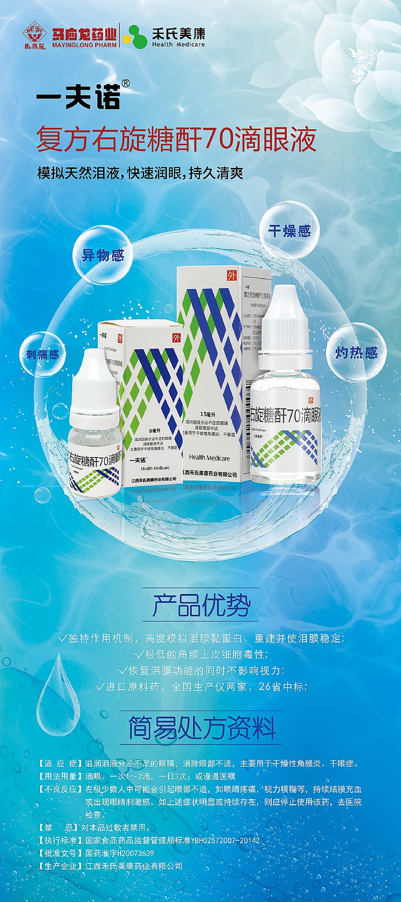 | 產(chǎn)品賣點(diǎn) | 人工淚液,模擬天然淚液、快速潤眼,持久清。 1、獨(dú)特作用機(jī)制,高度模擬淚膜黏蛋白、重建并使淚膜穩(wěn)定; 2、極低的角膜.上皮細(xì)胞毒性; 3、恢復(fù)淚膜功能的同時(shí)不影響視力; 4、進(jìn)口原料藥,全國生產(chǎn)僅兩家,26省中標(biāo); |