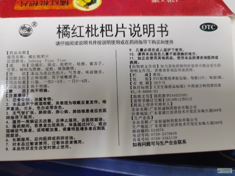 | 補充說明 | 橘紅枇杷片的主要成分化橘紅,原產(chǎn)地就在廣東,所以廣東恒誠制藥生產(chǎn)的橘紅枇杷片,材料地道,口感好,可以含服,療效好 主要成分,化橘紅,陳皮,枇杷葉,桔梗,紫蘇子,甘草等 |