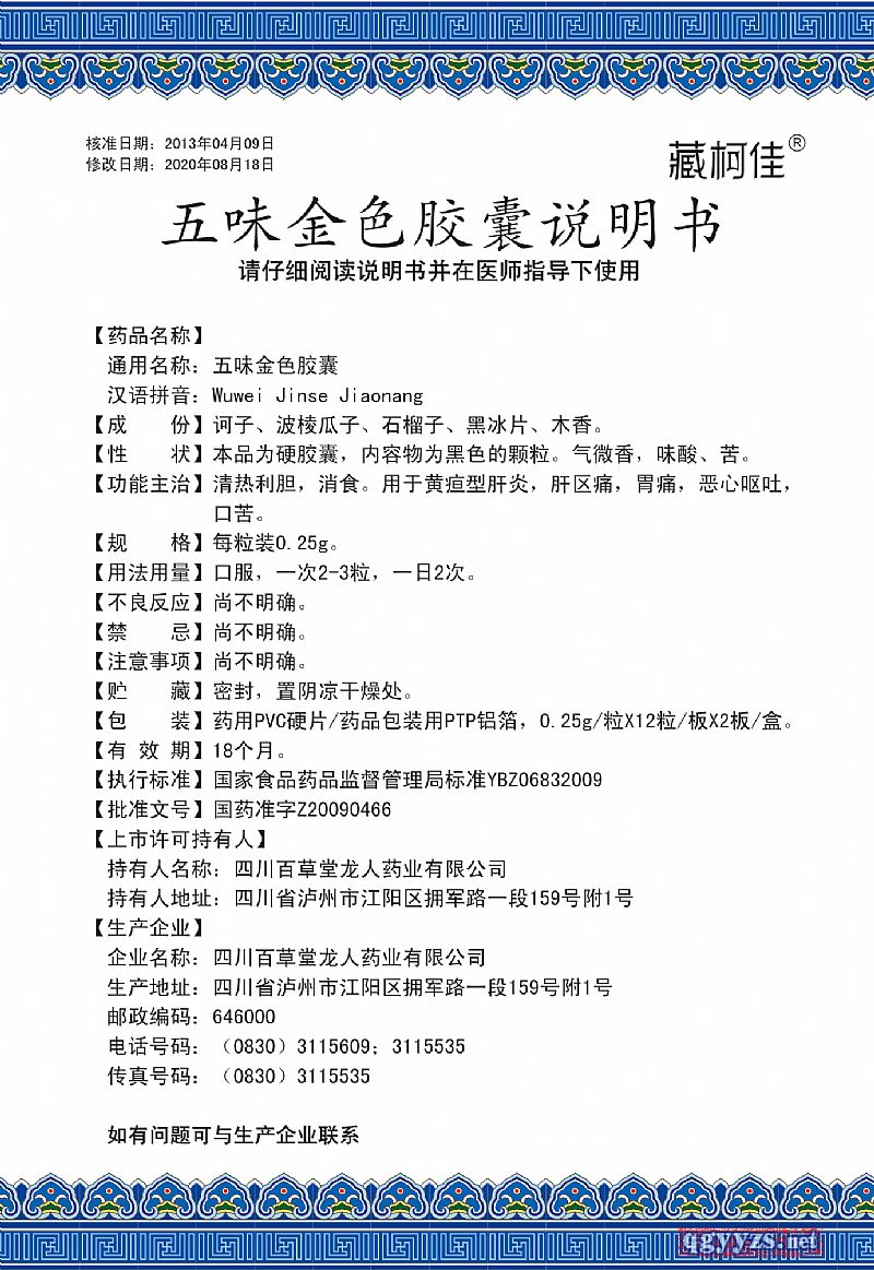 | 補(bǔ)充說(shuō)明 | 藏柯佳-五味金色膠囊是一款采用中醫(yī)系統(tǒng)性理論治療“肝病”的國(guó)家級(jí)新藥,具有調(diào)理肝、膽、脾胃,保肝護(hù)肝,疏肝理氣,清肝利膽,健脾和胃,止痛,殺菌,抗病毒,退黃等功效。 適用于西醫(yī)相對(duì)應(yīng)的肝膽科、消化內(nèi)科、泌尿科等科室,治療因肝病而引起的各類型肝炎、膽囊炎、膽石癥、泌尿系統(tǒng)炎癥與結(jié)石、消化性潰瘍、胃腸道炎癥、消化不良、便秘、惡心、嘔吐口苦等癥,效果突出,可靠性高,值得大力推廣。 |