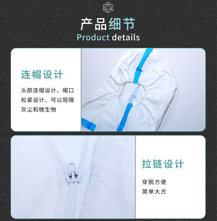 | 使用方法 | 展開防護(hù)服,拉開拉鏈,從拉鏈開口處依次伸入雙腿,再穿著上衣,手從衣袖中伸出,帶好頭套,從胸前正面拉好拉鏈。 |