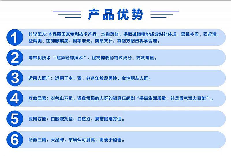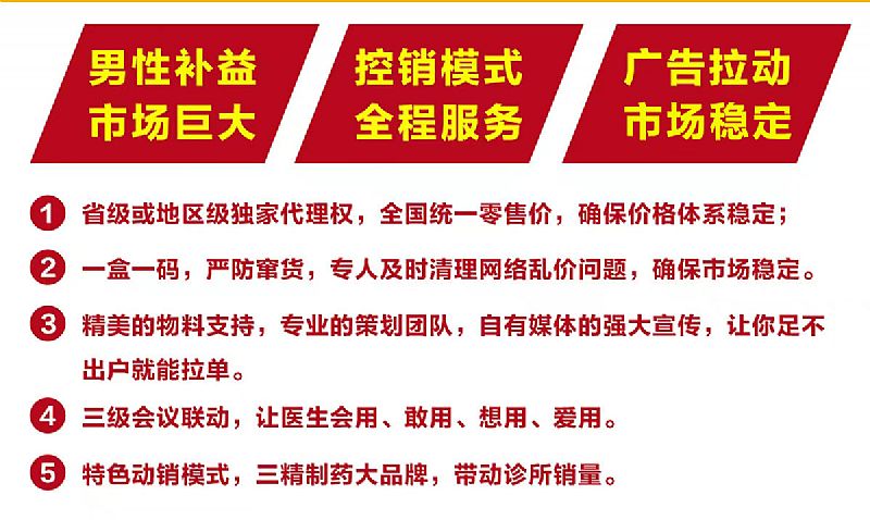 | 補充說明 | 復(fù)方雄蛾益精口服液屬于純中藥制成,小分子作用吸收更快,由大品牌生產(chǎn),品質(zhì)更有**,療效更加可靠。 產(chǎn)品優(yōu)勢: 1、科學(xué)配方:本品屬國家專利技術(shù)產(chǎn)品,地道藥材,提取雄蛾精華成分對補體虛、男性補腎、固腎精,益精髓、前列腺疾病、固本培元,陰陽雙補,其配方配伍科學(xué)合理。 2、用專利技術(shù)“超微粉碎技術(shù)”、提高藥物的有效成分、藥效明顯。 3、適用人群廣:適用于中、青、老各年齡段男性、女性朋友人群。 4、療效**:對氣血不足、腎虛虧損的人群的能真正起到“提高生活質(zhì)量,補足腎氣活力四射”。 5、服用方便:口服液劑型,口感好,攜帶服用方便。 6、哈藥三精,大品牌,市場認可度高,更便于銷售。 代理優(yōu)勢: 1、省級或地區(qū)級獨家代理權(quán),全國統(tǒng)一零售價,確保價格體系穩(wěn)定; 2、一盒一碼,嚴防竄貨,專人及時清理網(wǎng)絡(luò)亂價問題,確保市場穩(wěn)定。 3、精美的物料支持,專業(yè)的策劃團隊,自有媒體的強大宣傳,讓你足不出戶就能拉單。 4、三級會議聯(lián)動,讓醫(yī)生會用、敢用、想用、愛用。 5、特色動銷模式,三精制藥大品牌,帶動診所銷量。 |