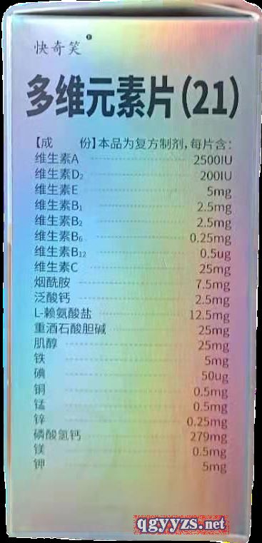 | 主要成分 | 本品為復方制劑,每片含維生素A2500IU、維生素D200IU、維生素E5mg、維生素B12.5mg、維生素B22.5mg、維生素B60.25mg、維生素B120.5μg、鐵5mg、銅0.5mg、鋅0.25mg、鎂0.5mg、煙酰胺7.5mg、泛酸鈣2.5mg、磷酸氫鈣279mg、L-賴氨酸鹽12.5mg、重酒石酸膽堿25mg、肌醇25mg、維生素C25mg、碘50μg、錳0.5mg、鉀5mg。輔 |