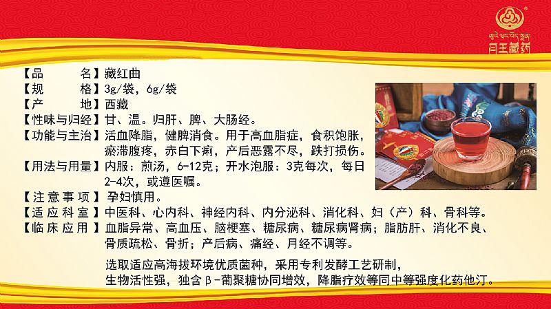 其它說明 藏紅曲為特色藏藥飲片,采用高含β-葡聚糖的西藏青稞為原料,選取適應(yīng)高海拔環(huán)境優(yōu)質(zhì)菌種,采用專利發(fā)酵工藝研制而成。藏紅曲性味甘、溫,歸肝、脾、大腸經(jīng),具有活血降脂,健脾消食的功效,用于高脂血癥、食積飽脹、瘀滯腹痛、赤白下痢、產(chǎn)后惡露不盡、跌打損傷。
