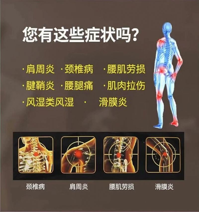 | 產(chǎn)品用途 | 腰椎間盤突出、膨出、腰椎管狹窄、坐骨神經(jīng)痛、腰肌勞損、強直性脊柱炎、股骨頭壞死、腰背部扭傷、跌打損傷、肩周炎、頸椎病、關(guān)節(jié)炎、骨刺、軟組織挫傷、頸肩四肢部位扭傷、跌打損傷、骨折、網(wǎng)球肘、腳跟痛、腱鞘炎等癥。 |