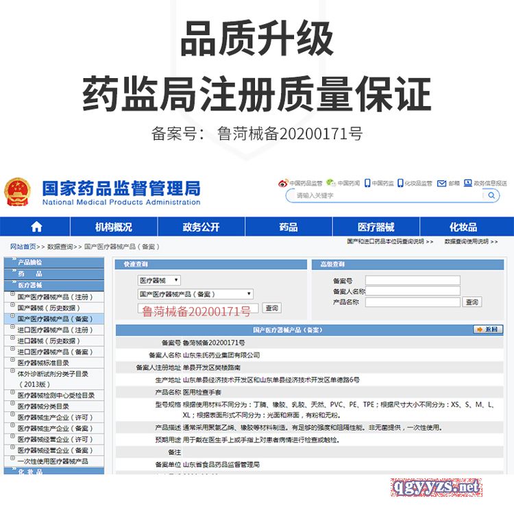 | 補(bǔ)充說明 | 【產(chǎn)品名稱】醫(yī)用檢查手套 【型號規(guī)格】PVC手套 XS、S、M、L、XL; 【產(chǎn)品描述】通常采用聚乙烯、橡膠等材料制造。有足夠的強(qiáng)度和阻隔性能。非無菌提供,一次性使用。 【預(yù)期用途】用于戴在醫(yī)生手上對患者病情進(jìn)行檢查或觸檢。 【使用方法】戴手套前,取下**手上飾品,并將指甲修剪平滑。按手術(shù)消毒通用規(guī)范對手部清潔,消毒和干燥,穿戴適合個人手型規(guī)格的手套,濕手會增加穿戴難度。 【注意事項(xiàng)】1、穿戴手套時,不得戴戒指或其他飾物,并將指甲修剪平滑。 2、不分左右手穿戴,請選擇適合本人手型規(guī)格的手套。 3、如發(fā)生包裝破損造成手套污染,請勿使用。 4、本產(chǎn)品僅供一次性使用,用后請銷毀。 5、嚴(yán)禁接觸油、酸、堿、銅、錳等對橡膠有害的金屬和化學(xué)藥物; 6、對聚乙烯制品使用有過敏史者慎用。 7、溫度過高會對塑膠手套產(chǎn)生很大的破壞性。 【備案號】魯菏械備20200171號 【生產(chǎn)企業(yè)】山東朱氏藥業(yè)集團(tuán)有限公司 |