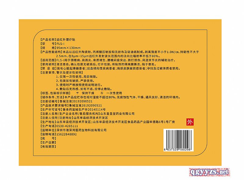 | 主要成分 | 本品由遠紅外陶瓷粉、丙烯酸壓敏膠和無紡布及硅油紙制成。剝離強度不小于1.0N/cm,持粘性應不大于2.5mm、在8μm-15μm遠紅外發(fā)射波長范圍內的法向比輻射率不低于80% |