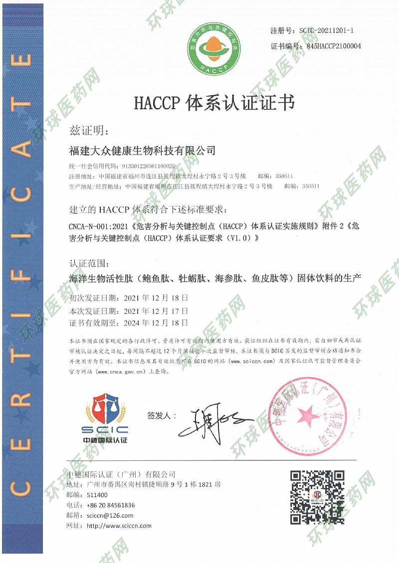 | 補充說明 | 1、原料來源:鮑魚、牡蠣、海參等海洋原料來自于大眾健康環(huán)保塑膠漁排鮑魚養(yǎng)殖基地4500畝,臨近東海、面向臺灣海峽,水流暢通,海水清澈,鹽度、溫度適中,海藻茂盛 2、鮑魚肽以鮑魚及其附產(chǎn)物為原料,經(jīng)過酶解分離,濃縮干燥制成鮑魚肽粉狀,是一種小分子,易溶解,澄清透明,活性強,還含有17種氨基酸,微量元素、維生素、EPA、DHA等成分 |