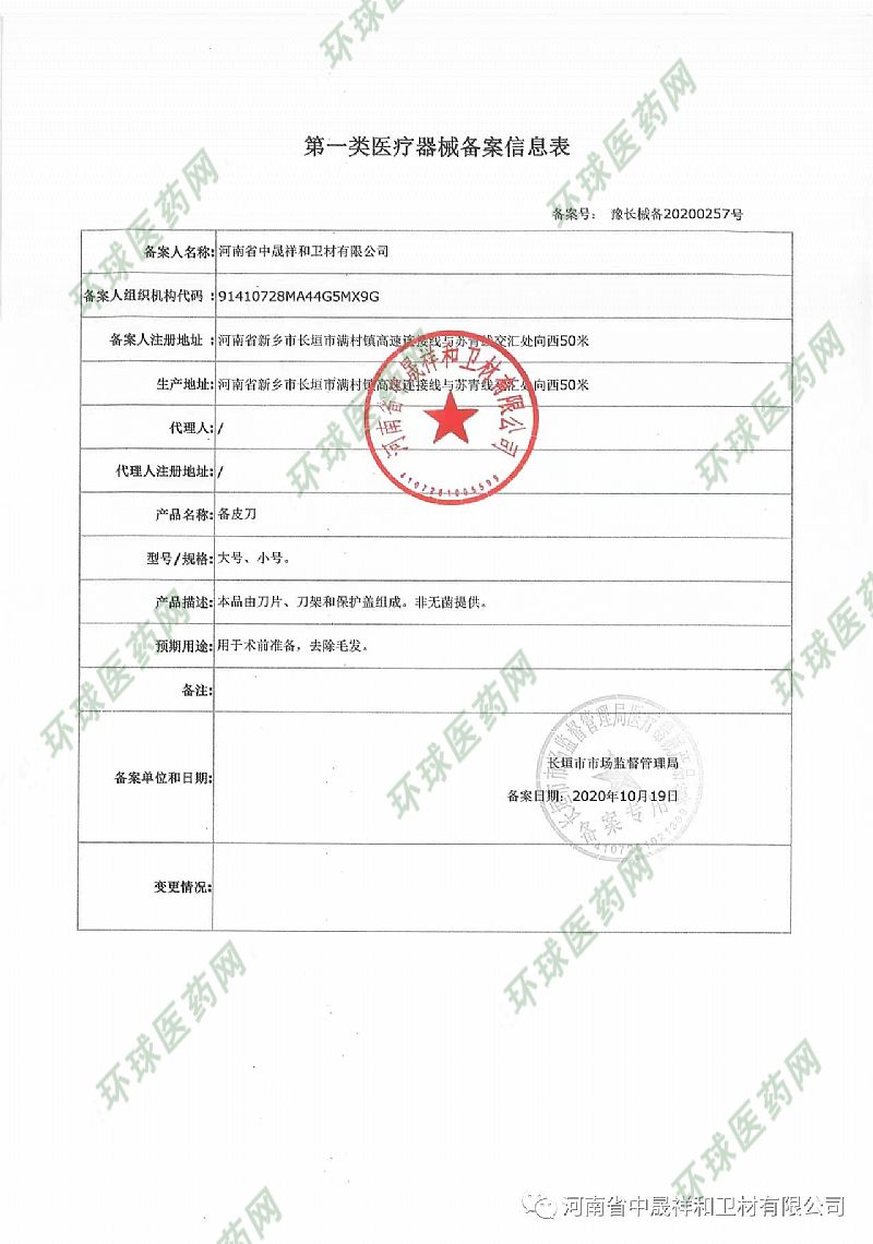 | 產(chǎn)品用途 | 備皮刀 THESKINKNIFE 型號(hào)、規(guī)格:大號(hào)、小號(hào) 產(chǎn)品描述:本品由刀片、刀架和保護(hù)蓋組成。 預(yù)期用途:用于術(shù)前準(zhǔn)備,去除毛發(fā)。 【生產(chǎn)企業(yè)名稱】河南省中晟祥和衛(wèi)材有限公司 【售后服務(wù)單位】河南省中晟祥和衛(wèi)材有限公司 【生產(chǎn)地址】河南省新鄉(xiāng)市長(zhǎng)垣市滿村鎮(zhèn)高速連接線與蘇青線交匯處向西50米 |